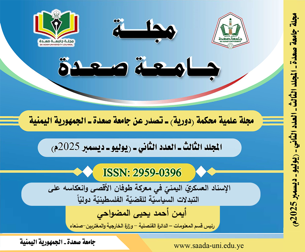 The study addressed the topic of Yemeni military support in the Battle of Tufan al-Aqsa and its reflection on the political changes of the Palestinian cause internationally. The problem of the study was to know the extent to which Yemeni military support in the Tufan al-Aqsa influenced the reconfiguration of international political stances toward the Palestinian cause?. Especially after the emergence of Yemen’s military capabilities in the Red Sea to support the Palestinian cause and oppose Israeli and American interests and their allies, leading to political, military, and economic repercussions. The study adopted an analytical descriptive approach to examine the variables that contributed to the Yemeni media landscape and the political dimension accompanying the Tufan al-Aqsa operation, as well as a historical approach focusing on the concept of the Palestinian cause. The study was divided into three axes: the first addressed the media landscape accompanying the Tufan al-Aqsa, the second discussed the Yemeni political dimension and its international connections, and the third focused on the reflection of Yemeni military support on the international political changes regarding the Palestinian cause. The study concluded that the Palestinian and Arab media, supported by social media platforms, played a role in highlighting the crimes of the Israeli occupation. Additionally, the military escalation in the Red Sea, presented by the targeting of ships linked to Israel, drew Yemen into direct conflict with international powers, threatening to turn the country into an arena for settling regional scores. This support also complicated regional alliances, as Iran’s support for Yemen in the context of the Palestinian conflict increased tensions with Saudi Arabia and its allies, impacting Yemeni peace negotiations.