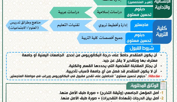 – أن يكون المتقدم حاصلاً على درجة البكالوريوس من إحدى الجامعات اليمنية أو جامعة معترف بها وبتقدير لا يقل عن جيد.