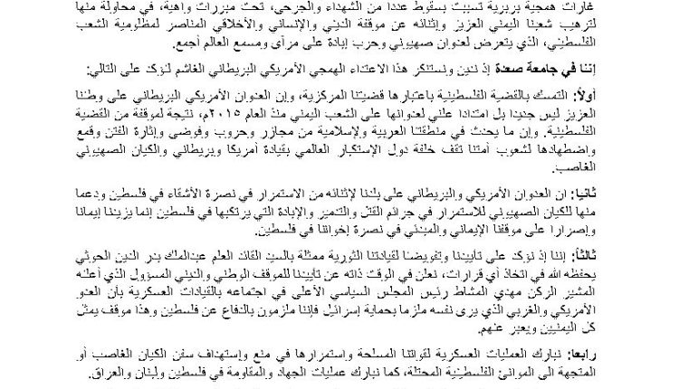 ثانيا: ان العدوان الأمريكي والبريطاني على بلدنا لإثنائه من الاستمرار في نصرة الأشقاء في فلسطين ودعما منها للكيان الصهيوني للاستمرار في جرائم القتل والتدمير والإبادة التي يرتكبها في فلسطين إنما يزيدنا إيمانا وإصرارا على موقفنا الإيماني والمبدئي في نصرة إخواننا في فلسطين.