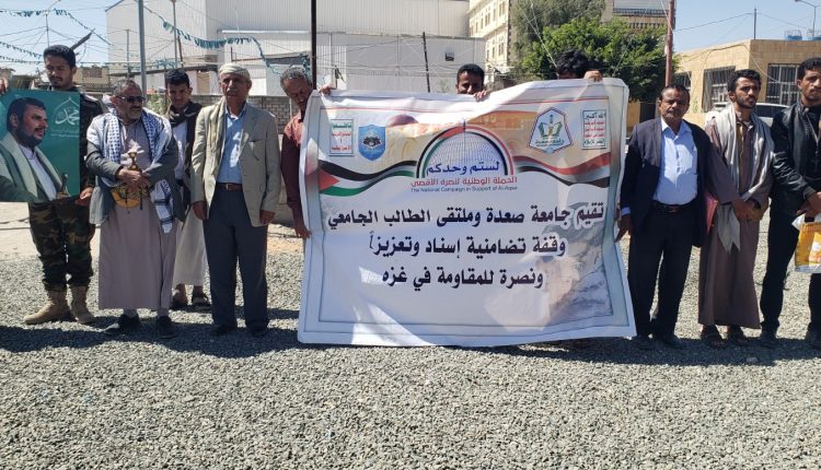 نظمت جامعة صعدة وقفة تضامنية مع الشعب الفلسطيني ومقاومته الباسلة وتنديدا بالمجازر الوحشية التي يرتكبها العدو الإسرائيلي بحق أبناء غزة وتأييدا ومباركة للعمليات العسكرية التي تنفذها القوات المسلحة تضامنا مع الشعب الفلسطيني، ضمن أنشطة الحملة الوطنية لنصرة الأقصى.