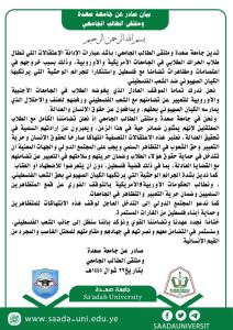 وأوضح البيان: ان طلاب ومنتسبو جامعة صعدة يعلنون تضامنهم الكامل مع الطلاب المعتقلين الذين يمثلون ضمائر حية في هذا الزمن ويعبرون عن إرادتهم السليمة في تحقيق العدالة”، معتبرين تلك الاعتقالات التعسفية انتهاكاً صارخاً لحقوق الإنسان وحرية التعبير وحق الشعوب في التظاهر السلمي.