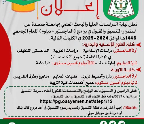 إعلان عن استمرار التنسيق لبرامج الدراسات العليا بجامعة صعدة للعام الجامعي 1446هـ
