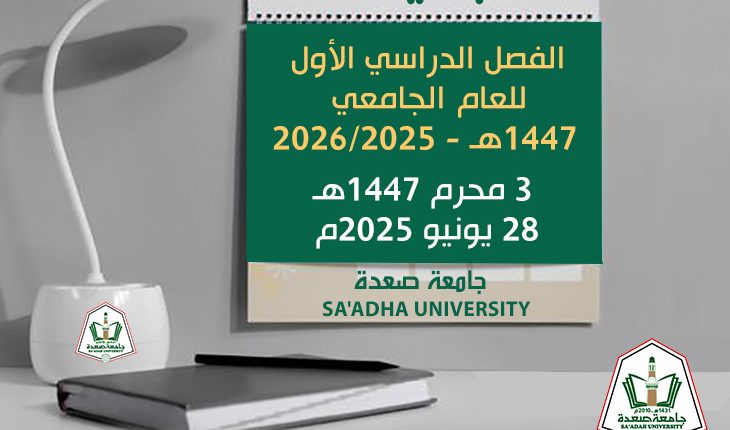 تعلن نيابة شؤون الطلاب بجامعة صعدة لطلاب المستوى الثاني والثالث والرابع، أن المحاضرات التدريسية لفصل الدراسي الأول للعام الجامعي 1447هـ- 2026/2025، قد بدأت من يوم السبت 3 محرم 1447هـ – الموافق 28 يونيو 2025م.