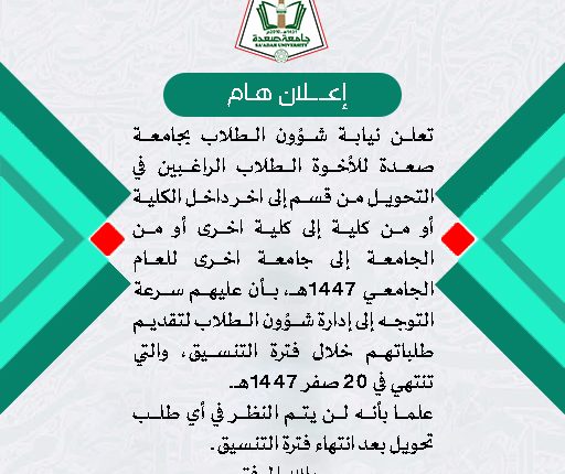 تعلن نيابة شؤون الطلاب بجامعة صعدة للأخوة الطلاب الراغبين في التحويل من قسم إلى اخر داخل الكلية أو من كلية إلى كلية اخرى أو من الجامعة إلى جامعة اخرى للعام الجامعي 1447هـ، بأن عليهم سرعة التوجه إلى إدارة شؤون الطلاب لتقديم طلباتهم خلال فترة التنسيق