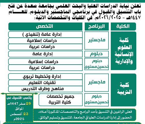 إعلان عن فتح باب التنسيق والقبول في برامج الدراسات العليا بجامعة صعدة 1447هـ