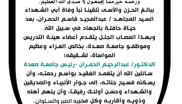 قال تعالى: ﴿ وَلَئِن قُتِلْتُمْ فِي سَبِيلِ اللَّهِ أَوْ مُتُّمْ لَمَغْفِرَةٌ مِّنَ اللَّهِ وَرَحْمَةٌ خَيْرٌ مِّمَّا يَجْمَعُونَ﴾ صدق الله العظيم. ببالغ الحزن والأسى تلقينا نبأ وفاة أبوي الشهداء السيد المجاهد / عبدالمجيد قاسم الحمران، بعد حياة حافلة بالجهاد في سبيل الله. وبهذا المصاب الجلل يتقدم أعضاء هيئة التدريس وموظفو جامعة صعدة، بخالص العزاء وعظيم المواساة، لشقيقه الدكتور/ عبدالرحيم الحمران – رئيس جامعة صعدة سائلين الله أن يتغمد الفقيد بواسع رحمته، وأن يسكنه فسيح جناته، إلى جوار الأنبياء والصديقين والشهداء وحسن أولئك رفيقا، وأن يلهم أهله وذويه وأقاربه وكل محبيه الصبر والسلوان.