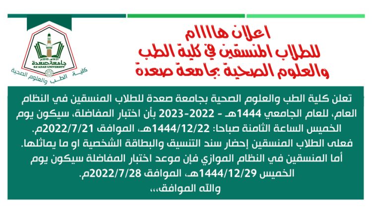 تعلن كلية الطب والعلوم الصحية بجامعة صعدة للطلاب المنسقين في النظام العام، للعام الجامعي 1444هـ – 2023-2022 بأن اختبار المفاضلة، سيكون يوم الخميس الساعة الثامنة صباحا: 22/12/1444هـ، الموافق 21/7/2022م. فعلى الطلاب المنسقين إحضار سند التنسيق والبطاقة الشخصية او ما يماثلها. أما المنسقين في النظام الموازي فإن موعد اختبار المفاضلة سيكون يوم الخميس 29/12/1444هـ، الموافق 28/7/2022م. والله الموافق،،،